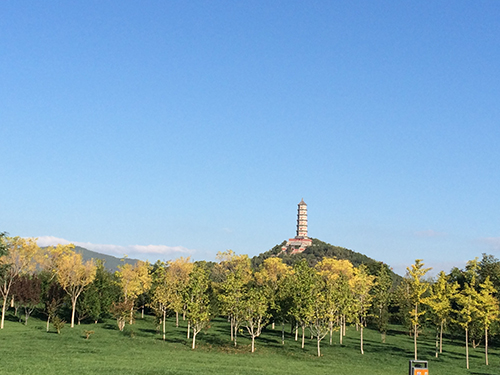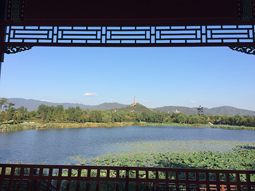 转过稻田,来到南边的农舍,几处农家院落干净整洁,旁边还有个石磨桌子、戏台和小广场,已有爷爷奶奶在跳秧歌舞。再往前行,来到一小湖边,一汪碧水,枯荷点点、飞鸟戏水。环湖南北建有亭台水榭,仿佛真的到了苏州园林。沿环湖路步入南亭台间,远眺玉泉山宝塔,犹如画中美景。真美啊,我都不想走了,歇一歇:闻一闻这里的花香草香,摸一摸玉泉山吹来的秋风。
